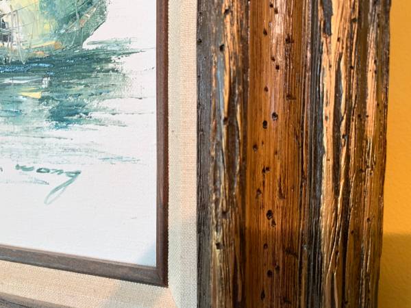A nice painting of Chinese junk boats/trading ships by P. Wong. Good vintage condition; some wear to the frame. I do not know the type of painting, oil or acrylic? I do not know what type of wood the frame is made from.