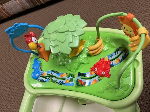 * Rainforest toy fits onto feeding tray—features tree with 3 spinning bugs, frog and gecko slider beads, bobbling parrot and bead bar with monkey and bananas