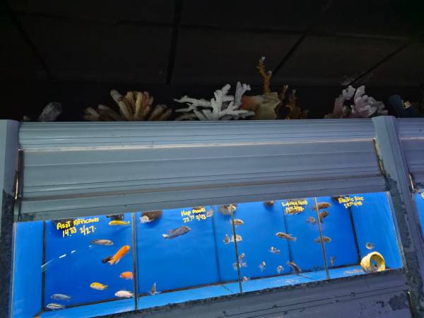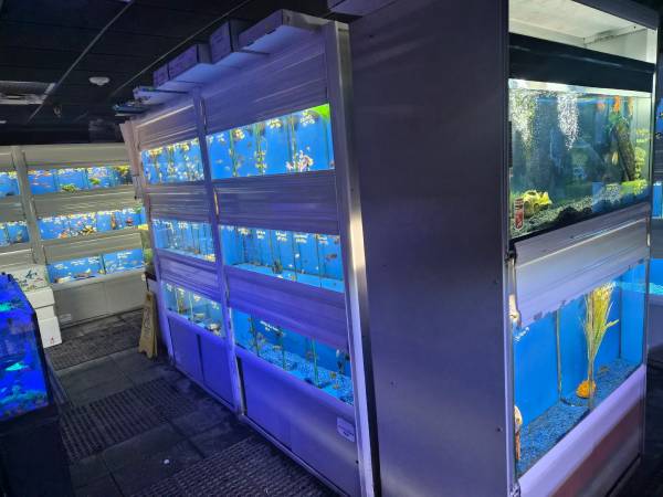 Can be sold as 1, 2, or 3 unit racks, containing 3 to 9 separate aquariums with dividers. Pictures are examples of available inventory- some units barely used.