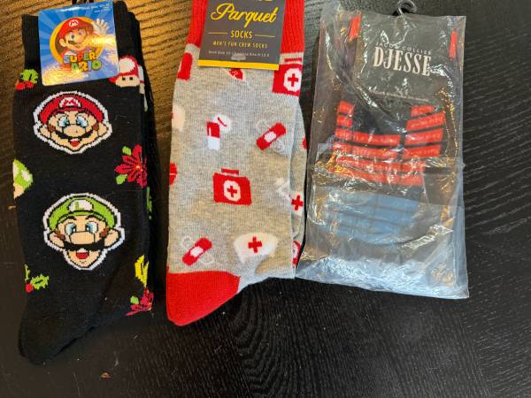 These are three pairs of brand new men's fun crew socks from different brands: Super Mario, Original Parquet, and Djesse Collier. These novelty socks add a little spice to their life.