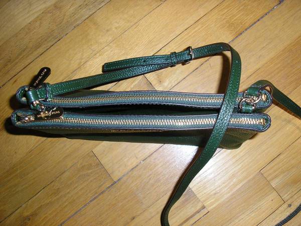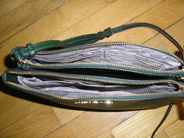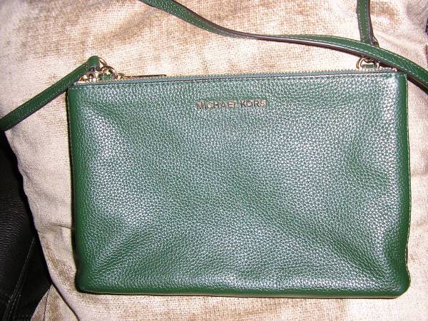 Michael Kors, olive green, genuine leather cross-body bag, with adjustable shoulder strap (24" drop). Two brass zippers & pulls, has 3 compartments. Inside the 2 zippered compartments there are many sewn-in pocket/holders for wallet, credit cards, phone, etc. Excellent Condition.