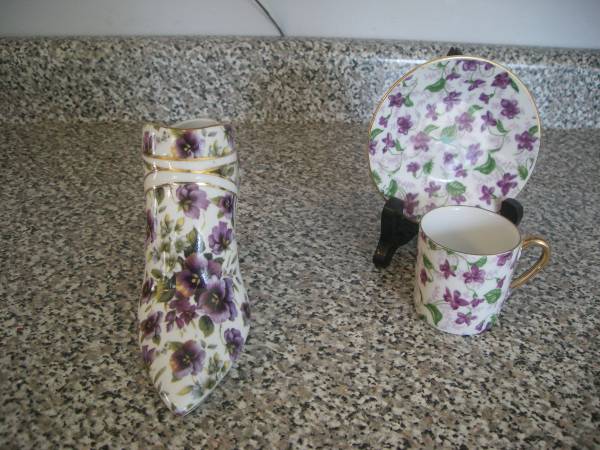Boot shoe & demitasse cup & Saucer, 10.00 each Boot shoe is Formalities by Baun Bros., if you are interested, please reply with your phone number and I will contact you, sorry I do not ship...