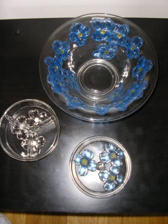 2. CANDY/CONDIMENT DISH, has 3 section base with clear flowers and cover with Blue Flowers, 6" diameter x 3 3/4"H .$20.