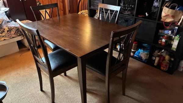 Selling dining table with 4 chairs. Table built with solid wood. Has some scratches on the surface from usage that’s why selling it at cheaper price. But it has been covered most of the time. You...