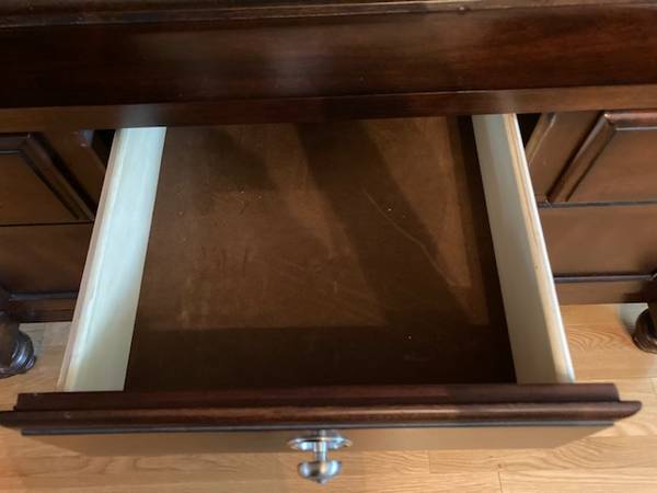 Farm Style Dining Room Set-Good Quality-Very Good Condition-Dark Mahogany Type Color(may not appear accurate in photos due to lighting)-see below for description and measurements-see photographs-Nothing wrong with this set but we are redecorating. This table can fit a big family or condense down for times when you are not expecting company and want the room.