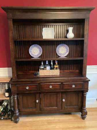 HUTCH-59" x 17 1/2" x 82 1/2" tall-has crown molding around top that sticks out slightly at the top-3 drawers plus cabinet underneath-3 shelves