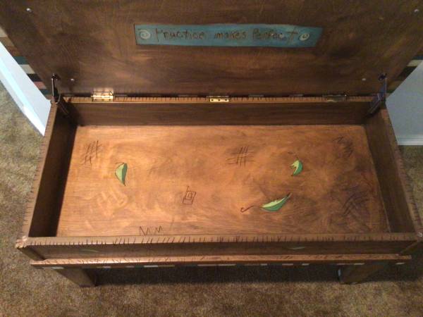 The measurements are 36” x 18” x 20” H. It is in perfect condition. I no longer have a piano but this has been used as an accent piece in my living room because of how unique it is. The original fabric top has been replaced by this whimsical music themed fabric. I have the original fabric to give to the person who buys this bench. Sticks will do after market changes, such as reupholstering the bench cover with a leather top. It will run you approximately $1,500 for the cover. I inquired which is why I had it reupholstered with fabric. But the leather covers are gorgeous. Just sharing.