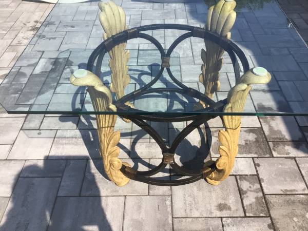 Beautiful 40” square table. The glass top and the base are heavy. The height is 29”.