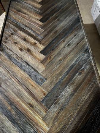 Purchased from Peter Andrews. Farmhouse, rustic engineered wood with wrought iron frame. Two nesting tables included. Mint condition