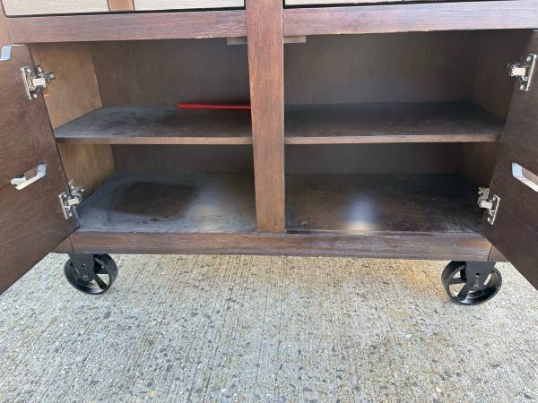 Rustic industrial kitchen island. Solid Wood “Reclaimed wood” look kitchen island on industrial metal wheels. About 5 years old. Some some scuffs and voids in the finish shown in pics. A stain touch up pen should be all you need.