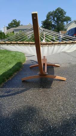 I'm selling a used hammock stand. The stand is wooden and made in an alluring arc shape. It measures 1 inch shy of 10 feet from metal connector eye to metal connector eye. Hammock not included.