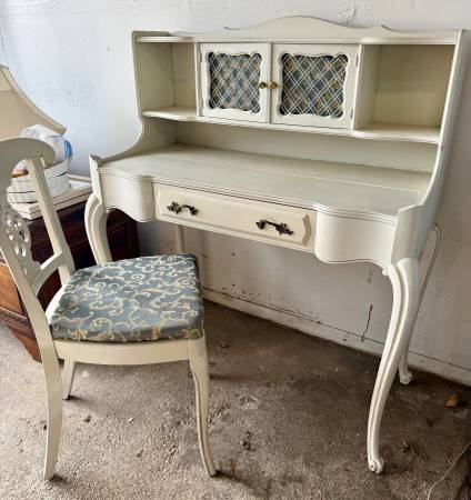 Painted Light Grey French Provincial Writing Desk and Chair. 40” w, 45” h, 18” d. Single drawer. Not a perfect paint job, but very presentable. No holds. Contact me when you’re ready to come see it....