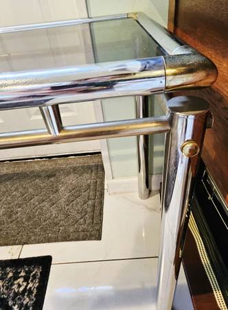 Mid Century Modern chrome console table that can be used as a desk or entry hallway accent piece featuring stained tempered glass top in good condition.