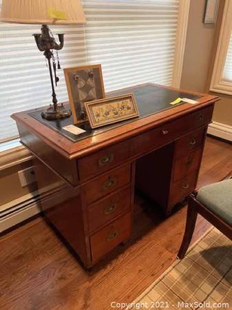 Antique Campaign style wood captain’s desk with inlaid leather. Top detaches from two bases with drawers. Condition: Good Measurements: 40x22x31