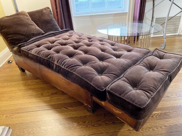 Antique XIXth century French Chaise / Day bed / Love seat. Patinated Brown Leather affixed with Upholstery Tacks.