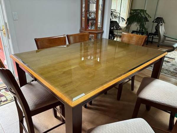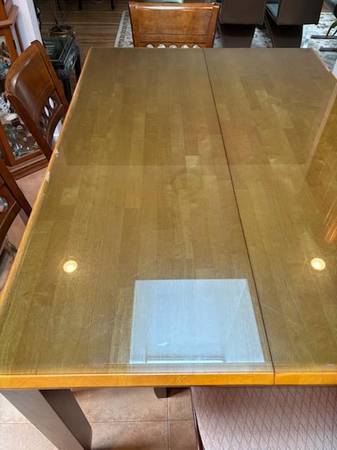 GREAT SET THERE IS AN EXPANSION LEAF EIGHT CHAIRS DIMENSIONS 60 x 42 x 3 FEET TALL WHEN EXPANDED 60 x 60 SOLID WOOD HIGH END TABLE NO BRAND NAME A GLASS TOP FOR THE 6 CHAIR TABLE WAS CUSTOM MADE...