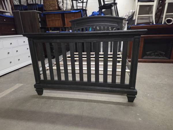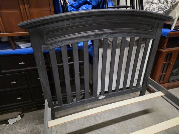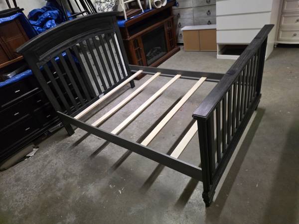 Selling a nice dark gray rustic style full sized bed frame in excellent overall condition. Includes the headboard, footboard, side rails and slats. Please call or text me at if you're interested....