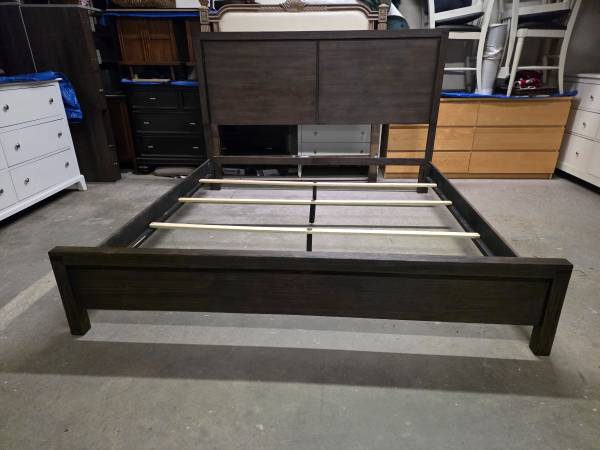 Selling a nice modern brown rustic style king size bed frame in excellent condition all around. Includes the headboard, footboard, side rails and slats. Please call or text me at if you're...