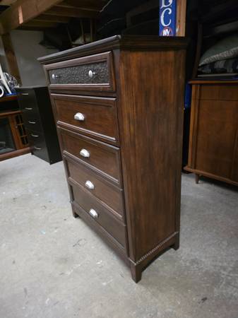 Selling a nice modern dark walnut color tall dresser or chest of drawers in excellent condition all around. Very solid and well made piece of furniture. Measures 55 inches tall, 38 wide and 18 deep. Please call or text me at show contact info
