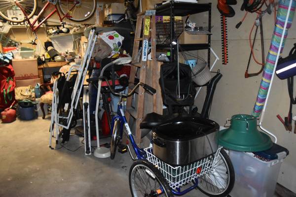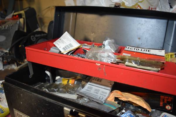 Garage: tools, boxes of unknown contents, table top drill press, porter cable router table, disc/belt sander, bar clamps, c clamps, rather large columbia vice, 16 Gauge nail gun brads (5000 count; spot nail brand 1.25", 1.5", 2"; $10 per box). Nail guns. unknown items on workbench at this writing. as we learn more i will update. there are at least 3 bicycles that appear to be in excellent condition, including a three wheeler for adults. electric snow thrower. at this time, rear of garage is packed and we have not gotten into it. two sets of golf clubs. i have seen some boxes of new golf balls around.