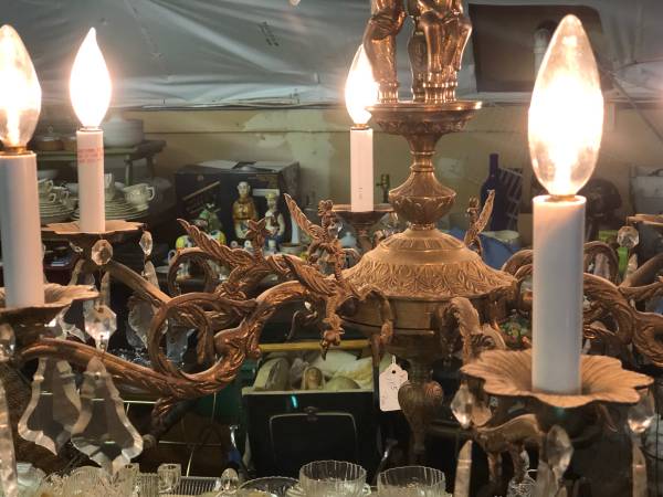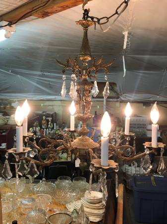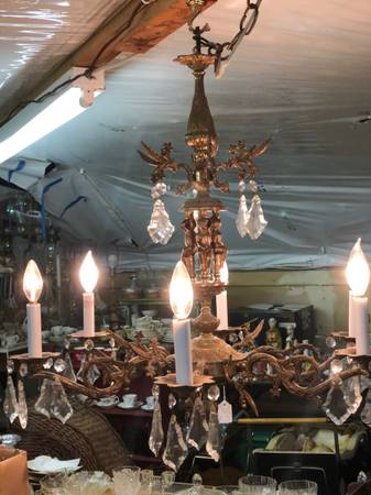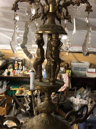 Six candelabra brass chandelier with crystal accents and cherubs is in good working order. 18 inches of wire and 12 inches of chain. Ceiling plate and hardware included. May be viewed by...