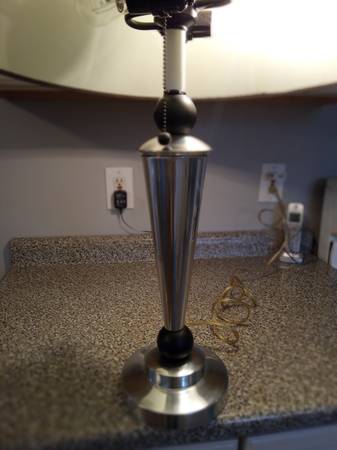 Table Lamp, silver tone, 30 inches tall and shade is 20 inches wide, 2 bulbs, if interested, please reply with your number and I will contact you, and sorry I do not ship my items.