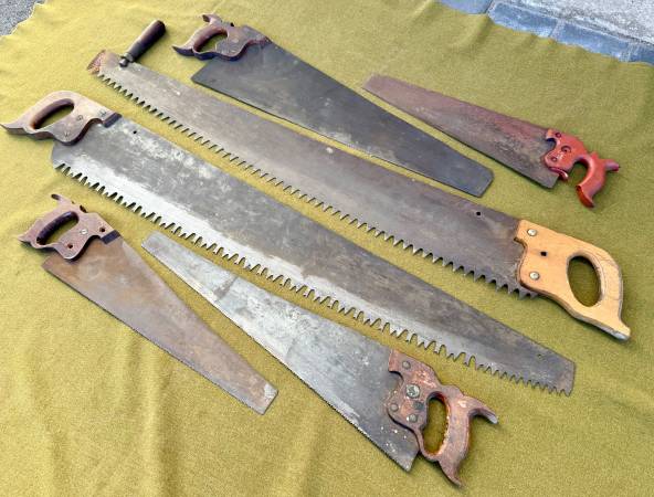 Antique Saw Collection. One man crosscut saw. Two man crosscut saw. Four hand saws. Selling only as a 6 piece lot. No holds. Contact me when you’re ready to come pick them up. Cash only. Calls only.