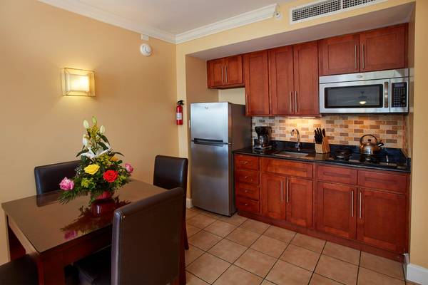 All Room amenities include a private balcony, fully equipped kitchen, washer dryer on floor, air-conditioning, television, and in-room safe.